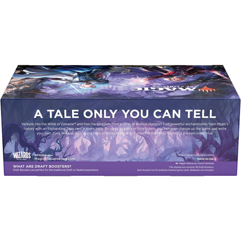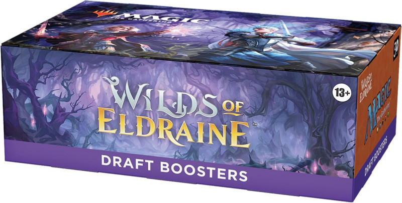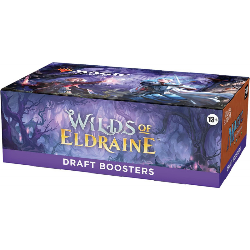 Your next adventure awaits! This Wilds of Eldraine Draft Booster Box contains 36 Wilds of Eldraine Draft Boosters. Each Draft Booster contains 15 cards and 1 token/ad card, including 1–2 cards of rarity Rare or higher, 3–4 Uncommon, 9 Common, and 1 Land cards (Full-Art Land in 33% of boosters). Every pack contains at least 1 special Borderless card of rarity Uncommon or higher and a Traditional Foil card of any rarity replaces a Common in 33% of boosters.