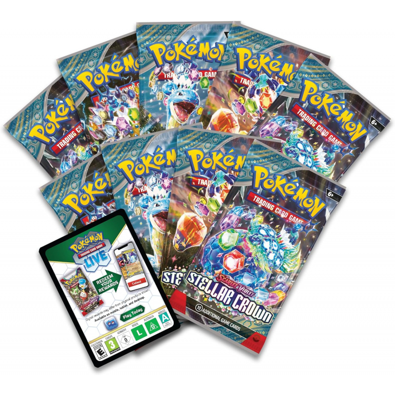 - Each Elite Trainer Box includes a player’s guide to the Scarlet & Violet—Stellar Crown expansion; a collector’s box to hold everything, with 4 dividers to keep it organized; and a code card for Pokémon Trading Card Game Live.
